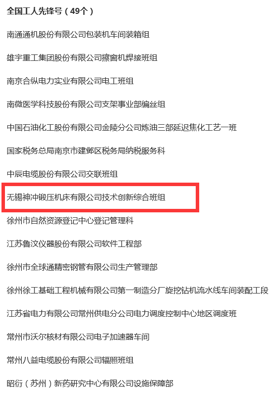 近日,《2023年全國五一勞動獎和全國工人先鋒號擬表彰對象公示》名單公布,江蘇共有13個單位擬獲全國五一勞動獎狀,52名個人擬獲全國五一勞動獎?wù)拢?9個班組、部門擬獲全國工人先鋒號,其中我司無錫神沖鍛壓機床有限公司技術(shù)創(chuàng)新綜合班組榜上有名,擬獲“全國工人先鋒號”。