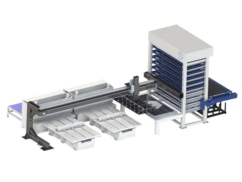 下料機(jī)構(gòu),由碼垛機(jī)械手、成品臺(tái)車等部件組成,可以實(shí)現(xiàn)剪切成品的板料抓取、板料輸送、自動(dòng)碼垛等功能。